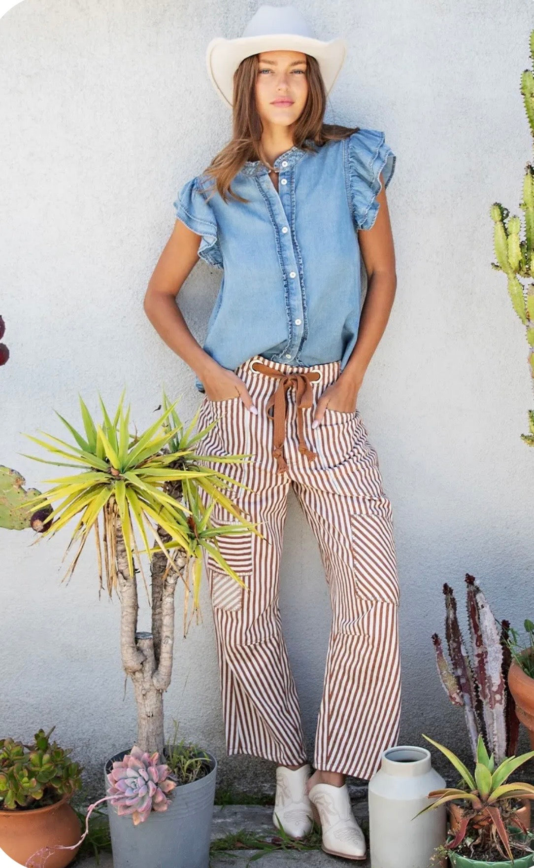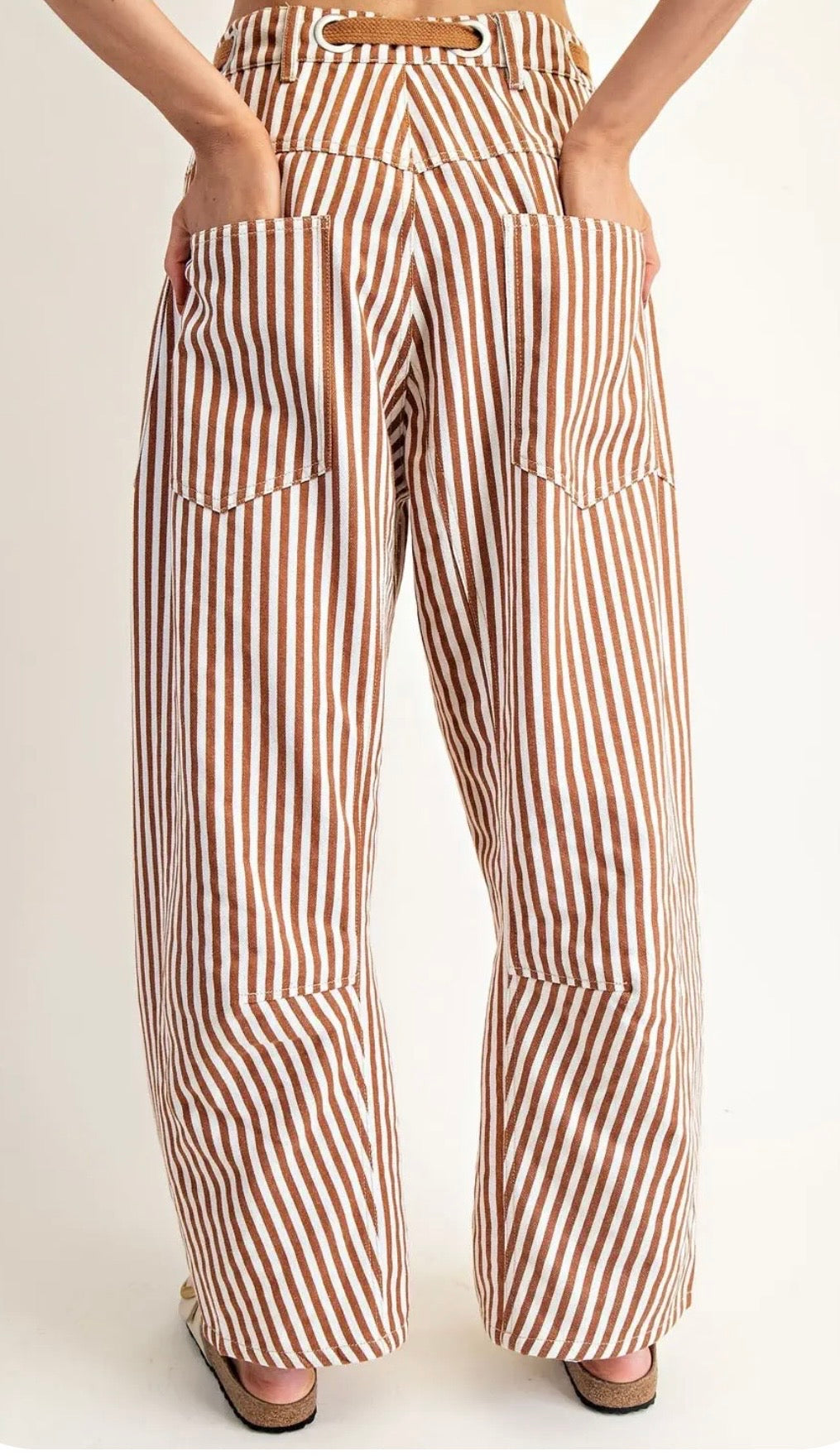 These fun striped pants showcase a drawstring waist with grommet accents, oversized front and back pockets, mixed patchwork detailing, and a relaxed barrel leg silhouette for a laid back yet structured look.