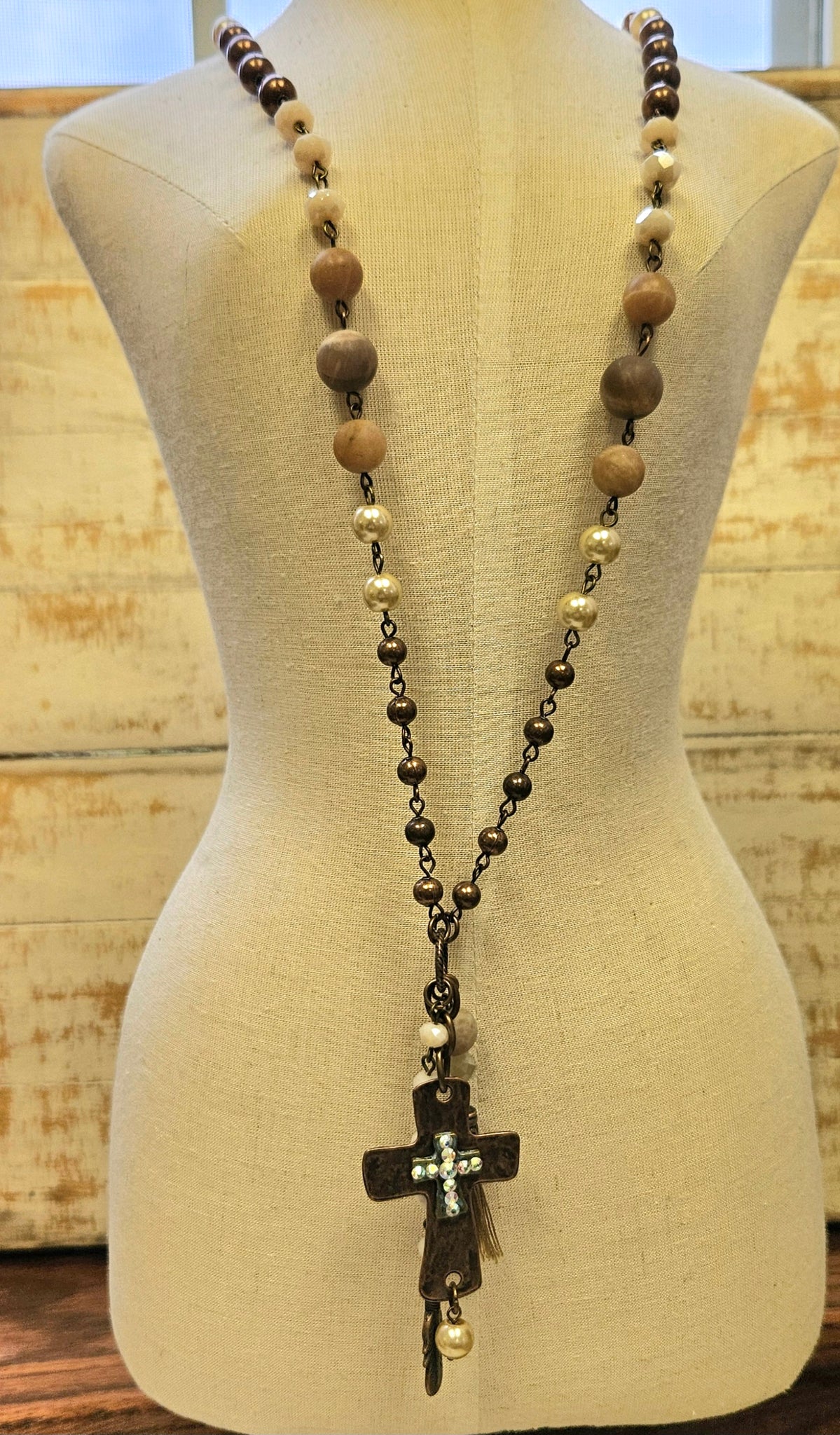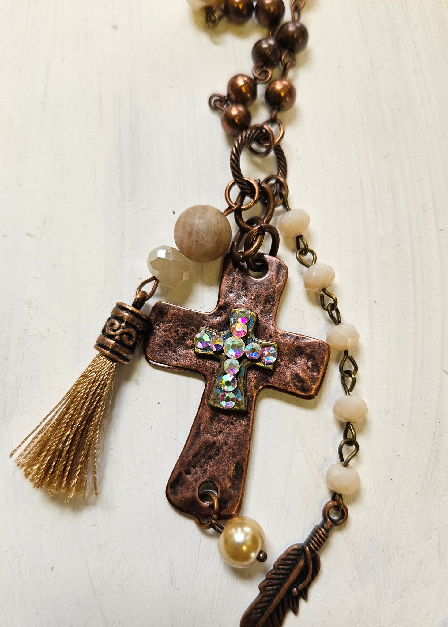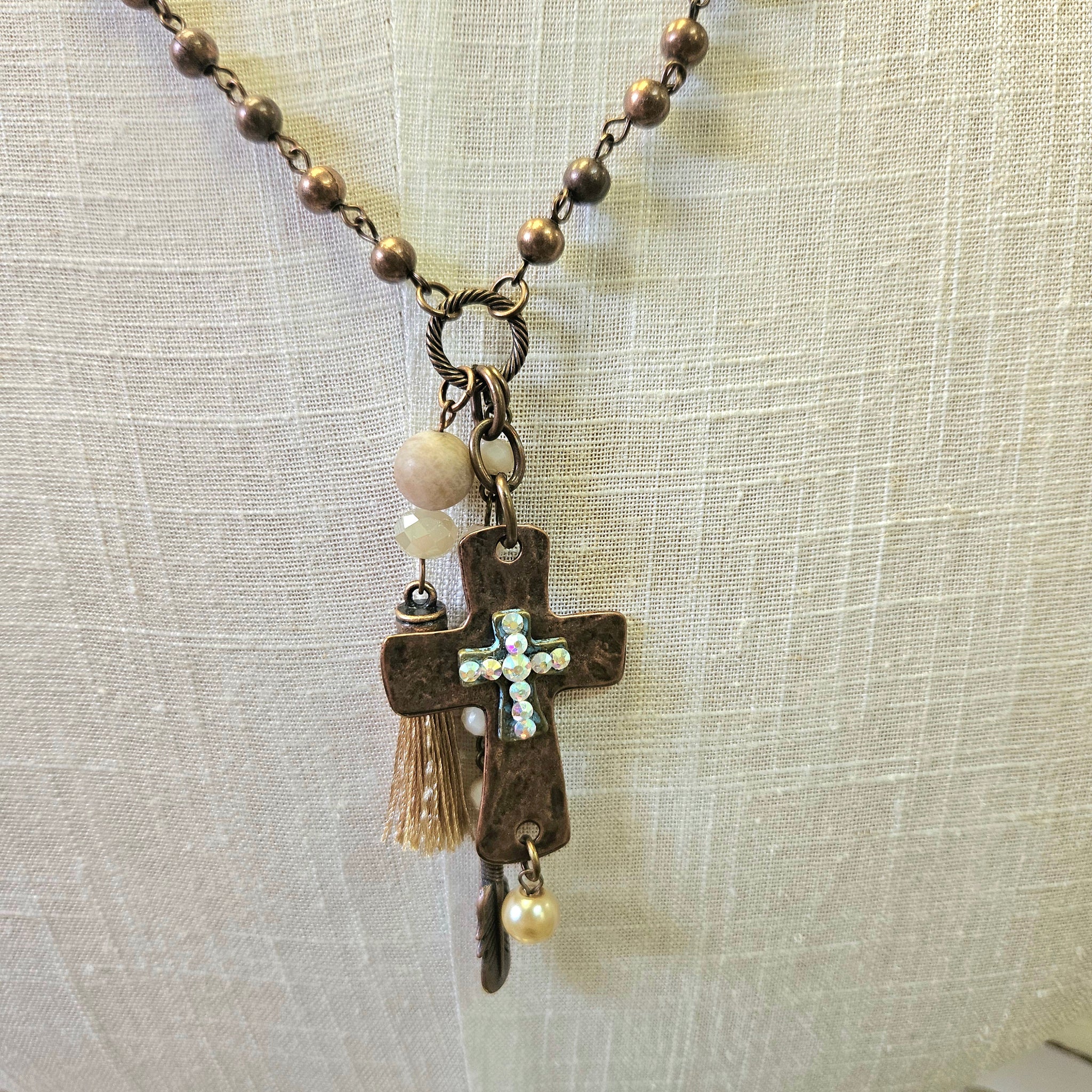 A beautiful necklace with the cutest charms. Copper cross with a pearl bead at the end and feather charm.
