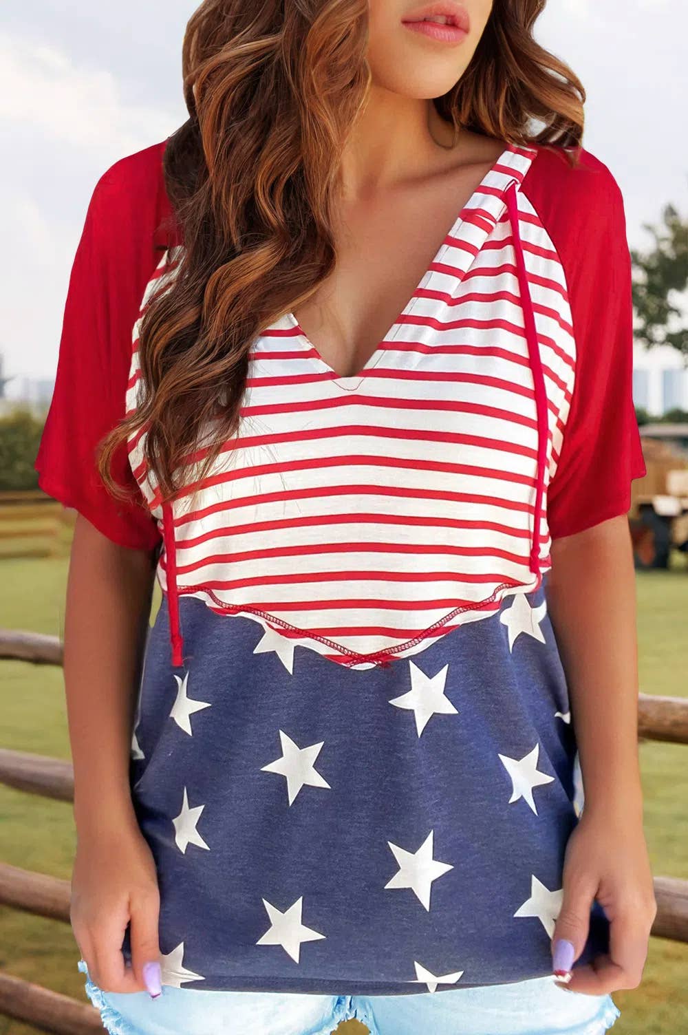 This printed top is a perfect blend of style and patriotism Short sleeves for a casual and comfortable look Hooded design adds a trendy touch Stylish V-neckline for a modern twist