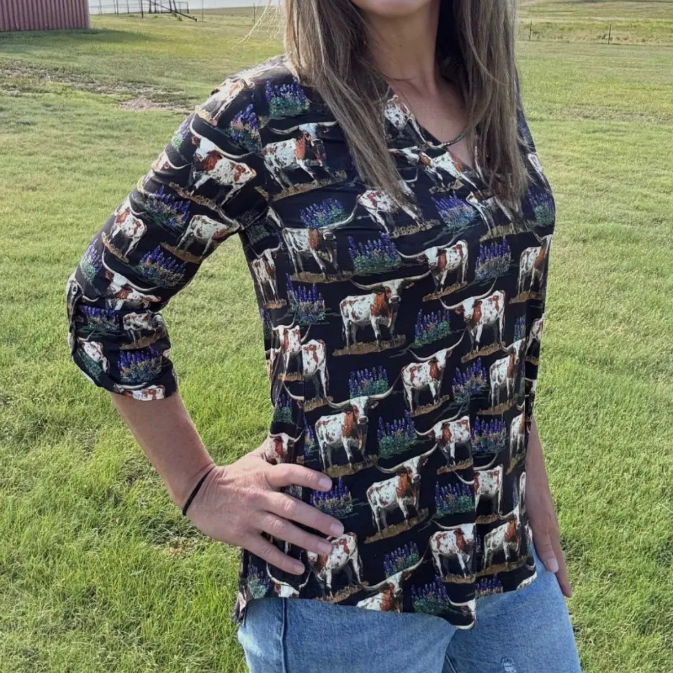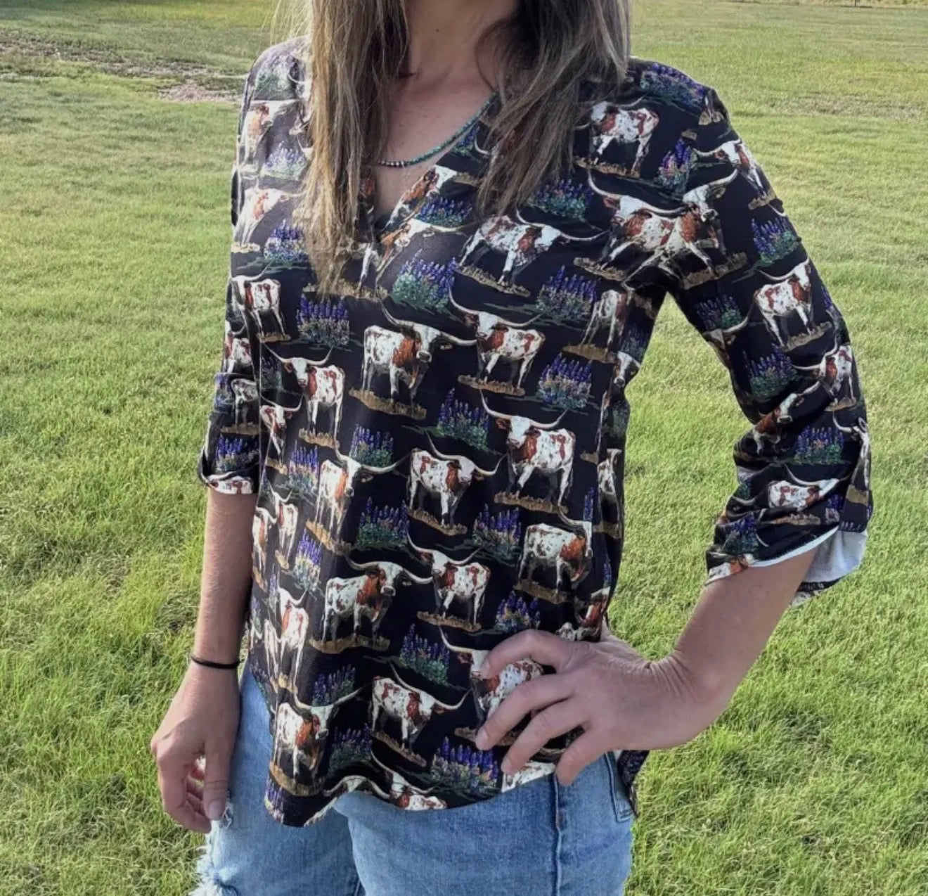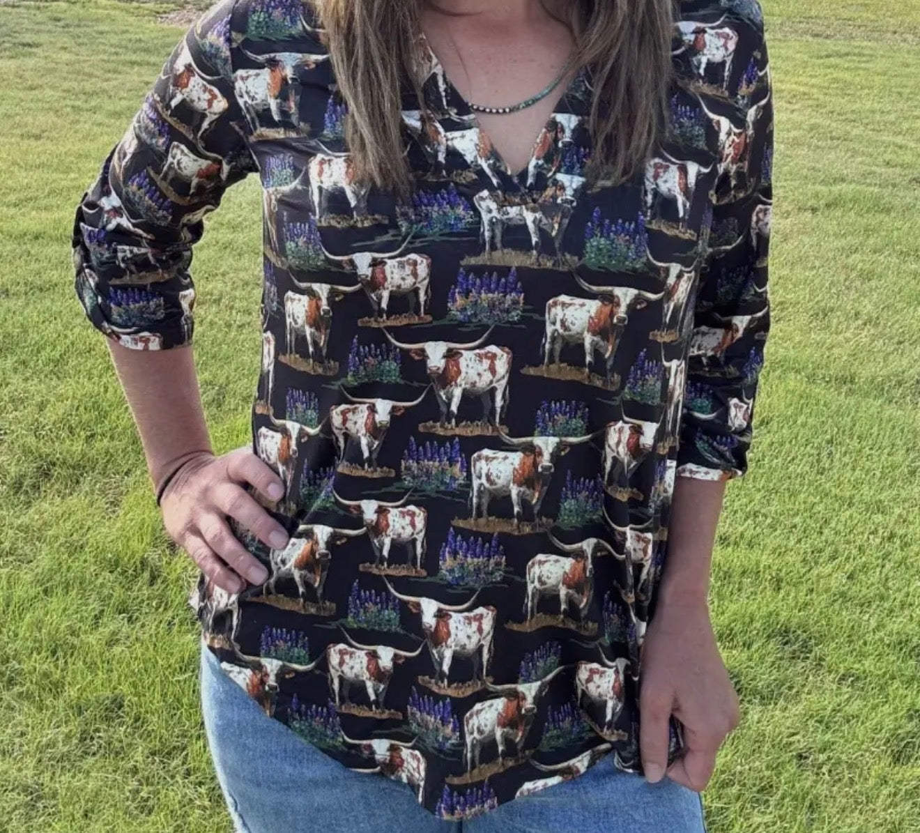 Embrace Texas spirit with the Heart of TX top, featuring stylish quarter sleeves and an eye-catching design of long horns and blue bonnets. This unique combination brings a bold, rustic charm to your wardrobe, perfect for standing out on any occasion. Comfortable and distinctive, it celebrates your love for TX heritage in a modern, wearable way.