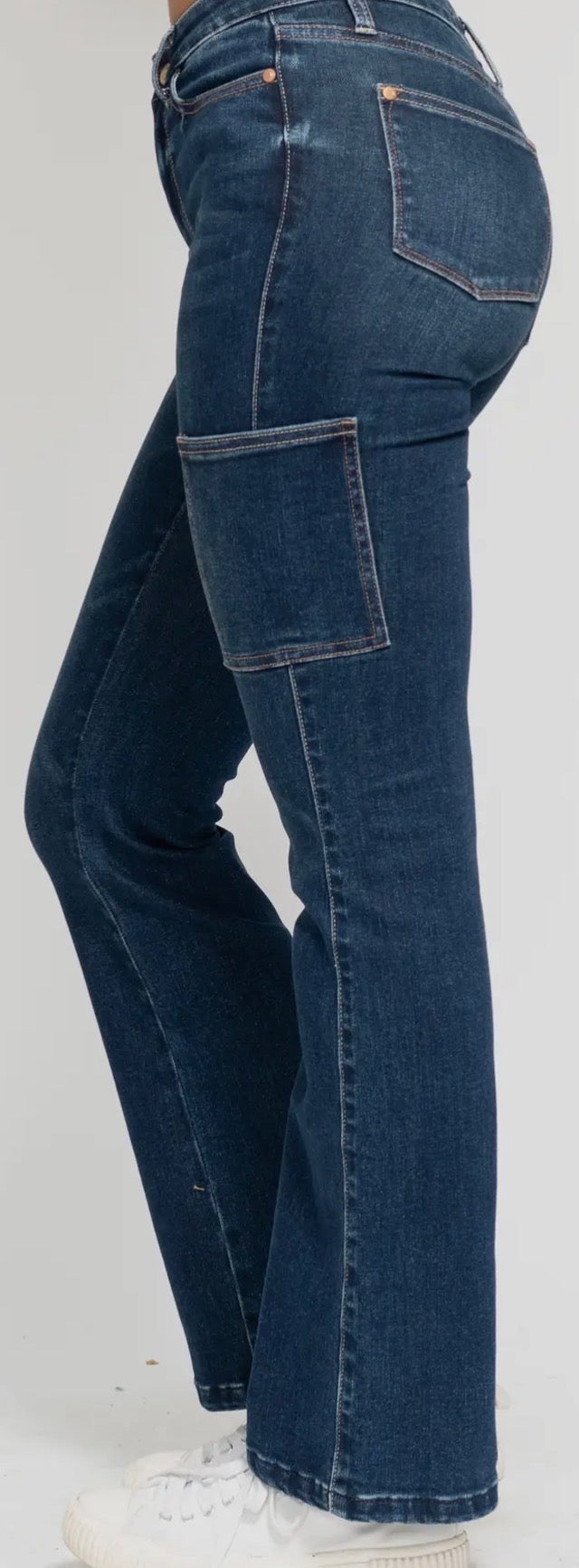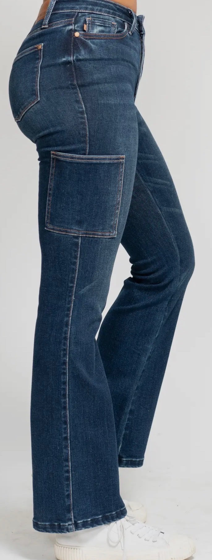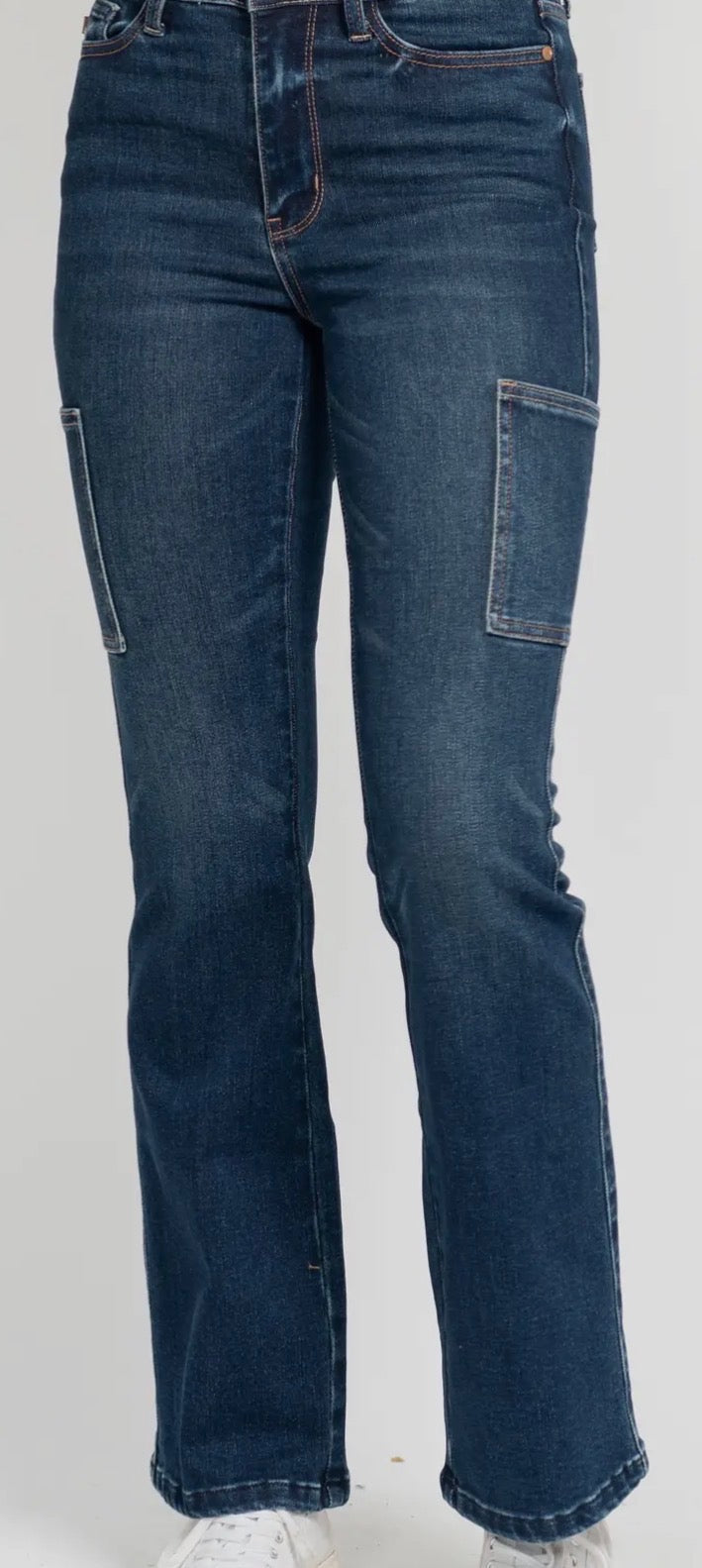 Step into the fall/winter season with our high waisted cargo bootcut jeans from Judy Blue Jeans. With a contemporary and casual vibe, these jeans are perfect for a day party or even a Fourth of July celebration. The high waist and bootcut design complement the dark wash, providing a trendy and comfortable look.