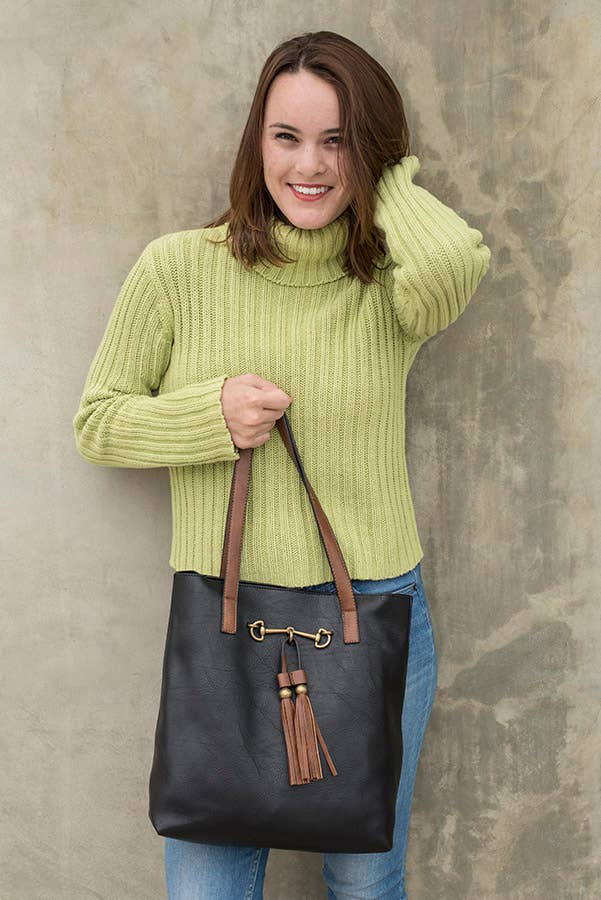 The Jane two in one tote is one of our most versatile bags. It comes in plush vegan leather and has a beautiful horse-bit and tassel detail with a zipper top closure. Inside is a separate and removable cross body bag that comes with its own adjustable strap. The Jane tote has plenty of space to hold all of your essentials. As an added bonus you can separately wear the zippered cross body bag with the enclosed straps. It's a classic bag that is truly multi-functional and great for work or travel.
