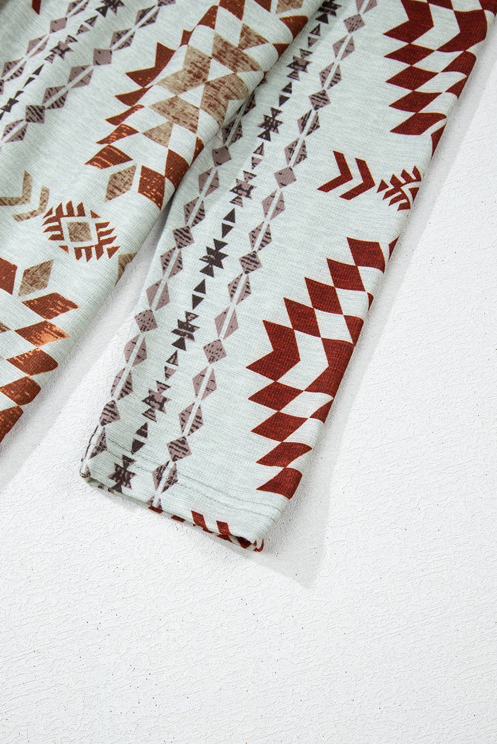 This cardigan shows a captivating Western-inspired Aztec print, bringing a unique and cultural touch to your wardrobe. Designed with an open front, this cardigan allows for versatile styling and an effortless layering piece. The long cardigan provides extra coverage and a dramatic silhouette perfect for making a statement. Made with a soft material, it's ideal for keeping warm while adding a fashionable layer to any outfit.