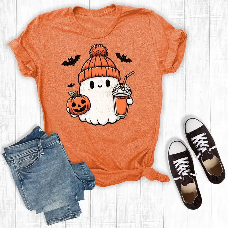 Halloween Ghost With Coffee Graphic Tee Orange - Plus