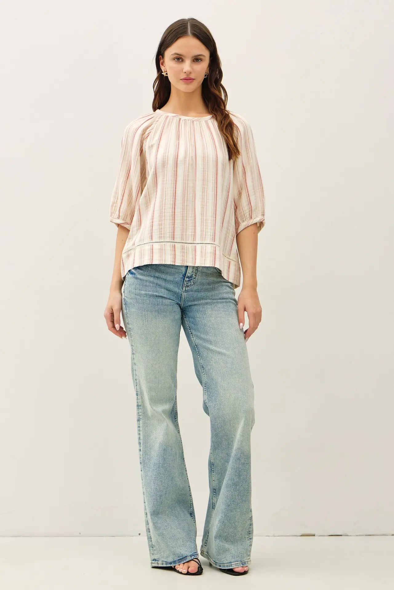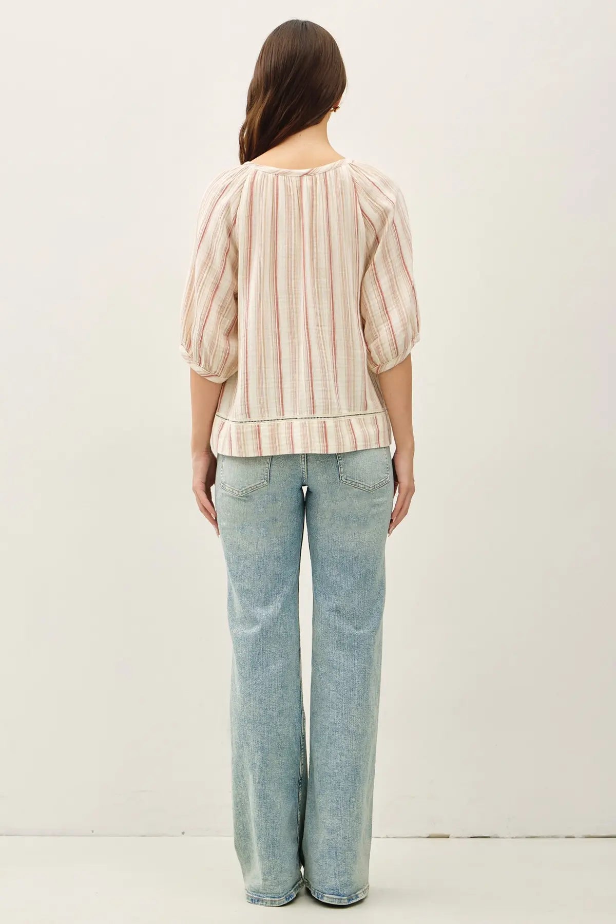 STRIPED DOUBLE GAUZE PUFFED SLEEVE TOP
